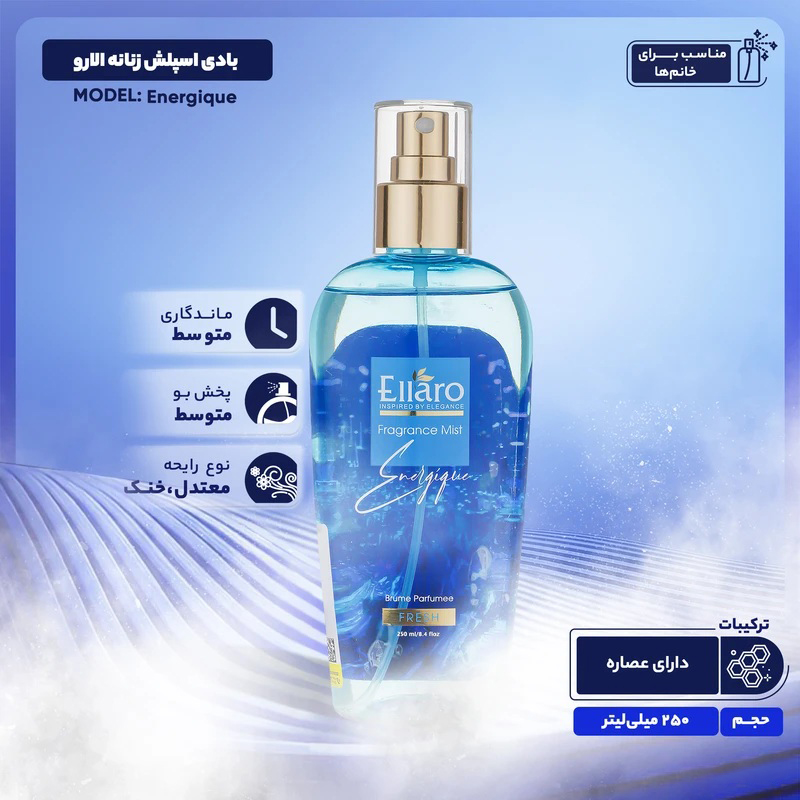 بادی اسپلش زنانه انرژیک الارو با رایحه خنک برای زنان جسور طراحی شده است. رایحه این خوشبو کننده نمادی از قدرت زنان را در ذهن ایجاد میکند که به هرآنچه بخواهند دست مییابند. بهترین گزینه برای استفاده بعد از فعالیتهای ورزشی.