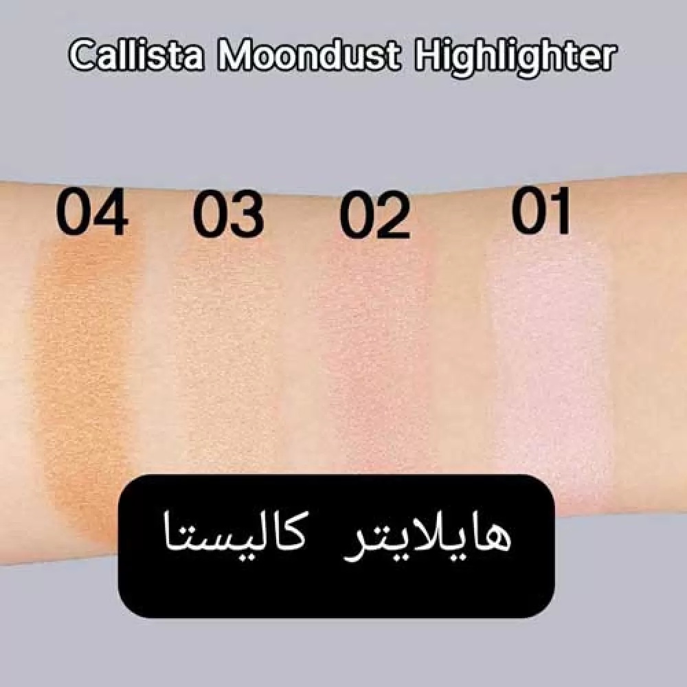 هایلایتر مونداست کالیستا با رنگ دهی بالا در چهار رنگ منحصر به فرد زیبایی شما را درخشانتر میکند. هایلایتر Moondust کالیستا رنگ دهی بسیار بالایی دارد و در عین حال باعث درخشش بیش از حد و غیر طبیعی صورت نمیشود. این هایلایتر دارای چهار رنگ منحصر به فرد است و بافتی نرم و ابریشمی دارد. همچنین روی صورت ماندگاری خوبی داشته و به درخشش پوست کمک زیادی میکند. استفاده از هایلایتر در برجستهسازی نقاط دلخواه صورت همچون گونه، چونه، پیشانی و … تأثیر زیادی دارد.رنگهای این هایلایتر برای پوستهای بسیار روشن، روشن، متوسط و تیره (تیره، گندمی، متوسط) قابل استفاده بوده و در کنار پنکک دوکاره کالیستا میتواند جلوه زیبایی شما را چندین برابر کند.استفاده از مواد اولیه با کیفیت در این محصول نه تنها زیبایی و درخشش آرایش شما را دو چندان میکند، بلکه به پوست شما آسیبی وارد نکرده و باعث لطافت آن میشود.